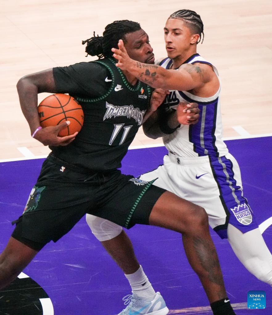 Naz Reid (L) of Minnesota Timberwolves competes during the 2025-2026 NBA regular season match between Sacramento Kings and Minnesota Timberwolves in Sacramento, the United States, Nov. 9, 2025. (Photo by Sun Yuxuan/Xinhua)