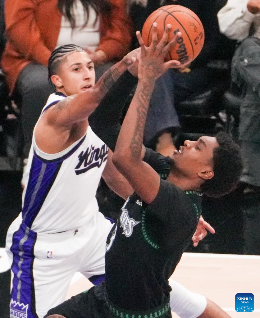 Keon Ellis (R) of Sacramento Kings shoots during the 2025-2026 NBA regular season match between Sacramento Kings and Minnesota Timberwolves in Sacramento, the United States, Nov. 9, 2025. (Photo by Sun Yuxuan/Xinhua)