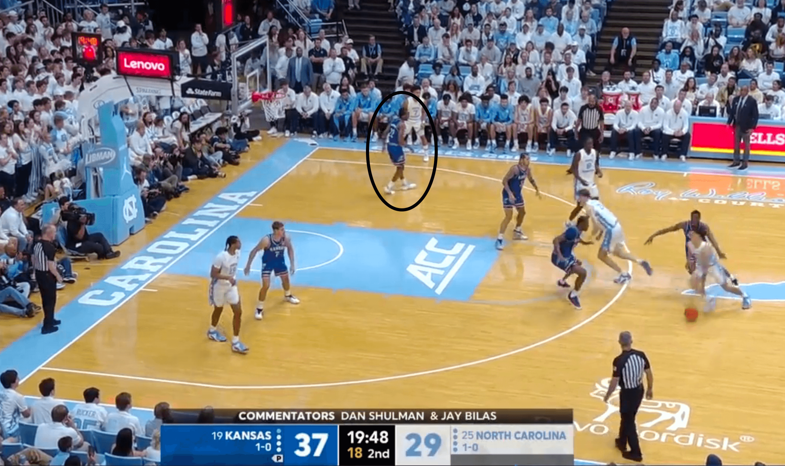 Veesaar is terrific in the pick-and-roll. He sets good screens and gets to the rim with pace, and he’s a huge target. During a 58-point second half, the Heels took advantage of KU’s shaky ball screen coverage, confusing KU’s guards on who should be the tag and also taking advantage of those tag guys playing way too far off the mid-line: