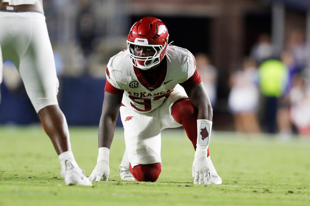Rhodes lines up both inside and outside for the Razorbacks, and his impressive length helps him create movement and shed blocks.