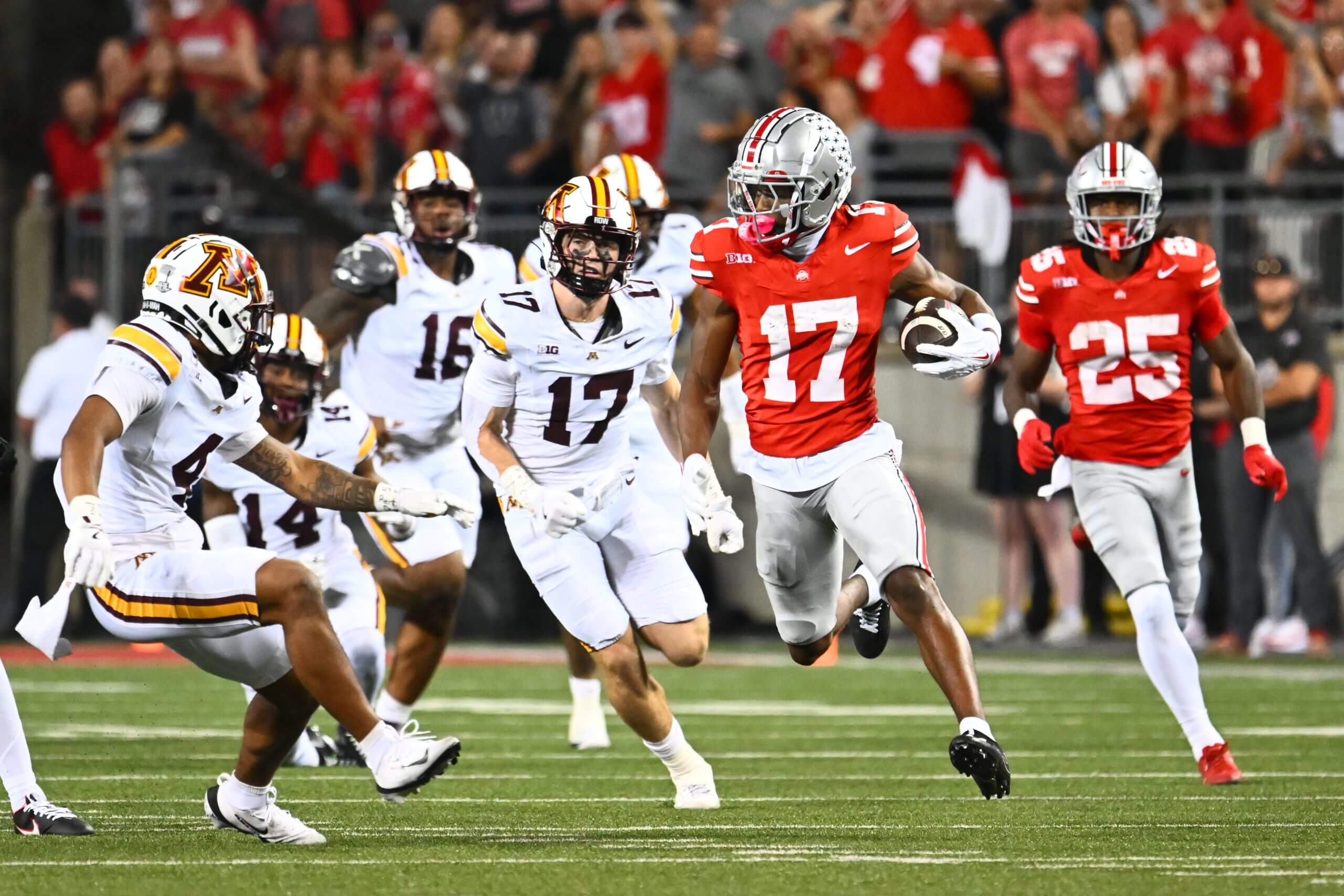 Ohio State linebacker Arvell Reese rushes the quarterback during a game against Minnesota.