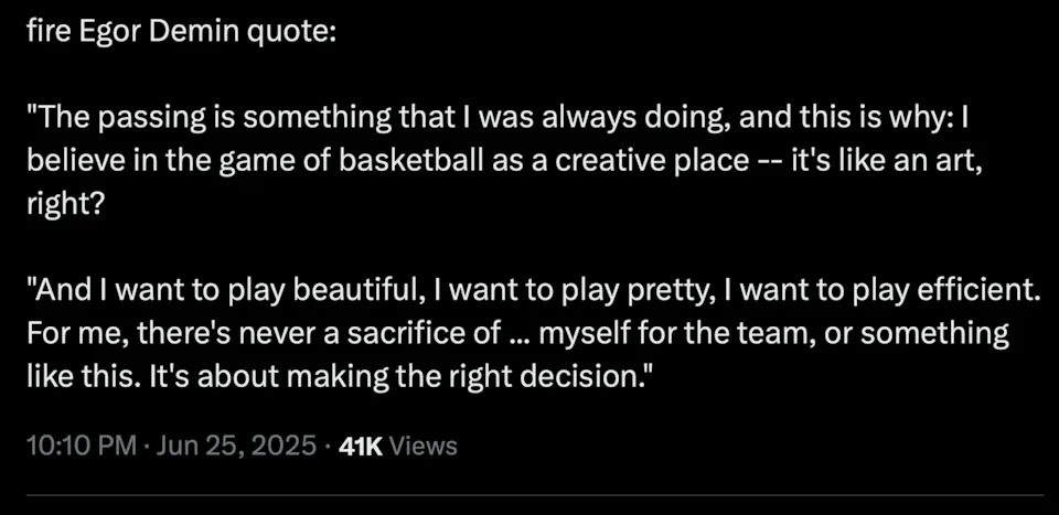 Some deep-in-the-weeds draft folks pointed out that in the summer of 2023, before Powell’s senior year of high school, he was the lead dawg on his (high level) AAU team before Duke commit (and likely 2026 NBA Draft entrant) Isaiah Evans joined the squad and took plenty of his usage. I’m sure the Nets scouts highest on Powell fired up that footage and liked what they saw.