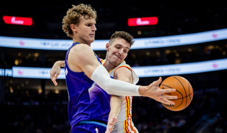 Utah Jazz forward Lauri Markkanen (23) and Atlanta Hawks guard Vit Krejci (27) go for the ball during an NBA game at the Delta Center in Salt Lake City on Thursday, Nov. 13, 2025. | Tess Crowley, Deseret News