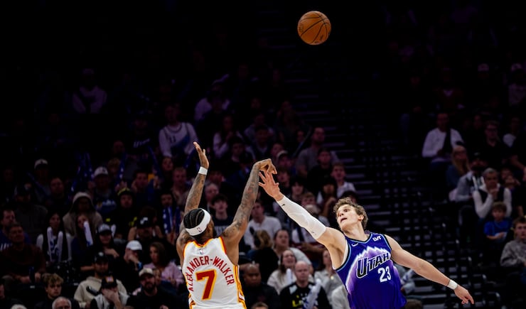 Atlanta Hawks guard Nickeil Alexander-Walker (7) goes up for a shot against Utah Jazz forward Lauri Markkanen (23) during an NBA game at the Delta Center in Salt Lake City on Thursday, Nov. 13, 2025. | Tess Crowley, Deseret News