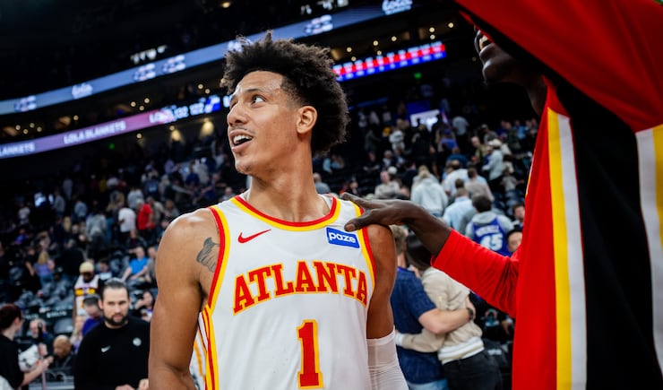 Atlanta Hawks forward Jalen Johnson (1) smiles with teammates after winning 132-122 against the Utah Jazz in an NBA game at the Delta Center in Salt Lake City on Thursday, Nov. 13, 2025. | Tess Crowley, Deseret News