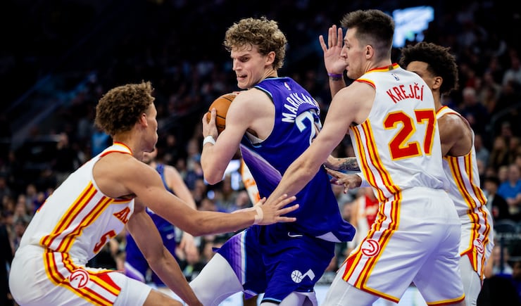 Utah Jazz forward Lauri Markkanen (23) is guarded by Atlanta Hawks guard Vit Krejci (27) and Atlanta Hawks players during an NBA game at the Delta Center in Salt Lake City on Thursday, Nov. 13, 2025. | Tess Crowley, Deseret News