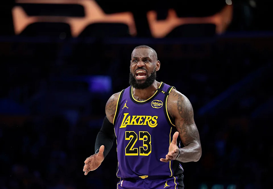 LeBron James reacts during a 117-108 Lakers win over the Miami Heat at Crypto.com Arena on Jan. 15, 2025 in Los Angeles.