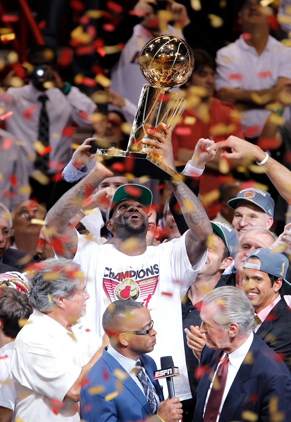 MIAMI, FL – JUNE 21: LeBron James #6 of the Miami Heat celebrates with the Larry O’Brien Finals Championship trophy after they won 121-106 against the Oklahoma City Thunder in Game Five of the 2012 NBA Finals on June 21, 2012 at American Airlines Arena in Miami, Florida. NOTE TO USER: User expressly acknowledges and agrees that, by downloading and or using this photograph, User is consenting to the terms and conditions of the Getty Images License Agreement. (Photo by Mike Ehrmann/Getty Images)
