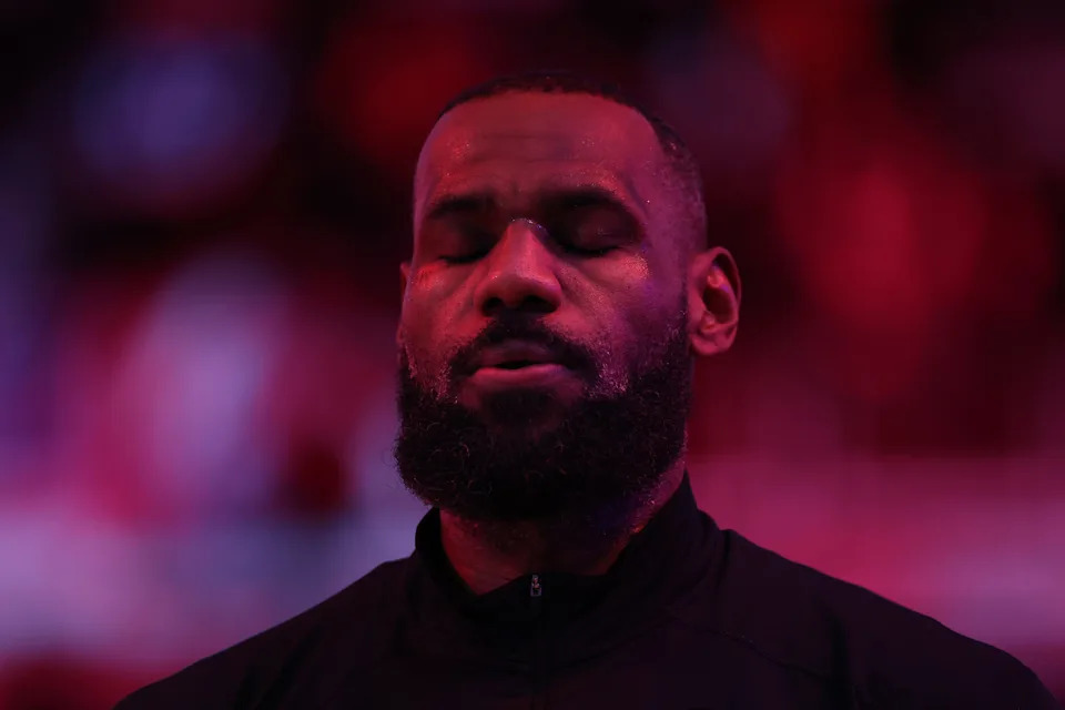 LeBron James reacts during warm up prior to the game against the Minnesota Timberwolves in Game One of the Western Conference First Round NBA Playoffs at Crypto.com Arena on April 19, 2025 in Los Angeles.