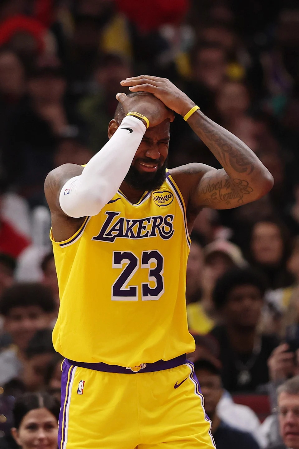 LeBron James reacts against the Chicago Bulls during the second half at the United Center on March 27, 2025 in Chicago, Illinois.