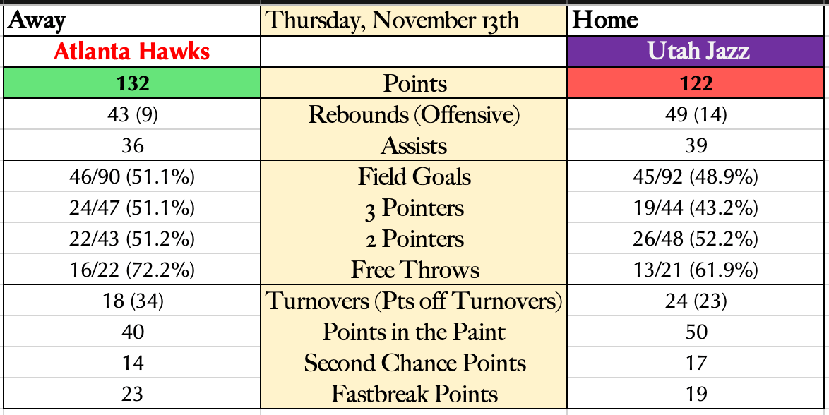 This stretch of turnovers proved to be too much to overcome for Utah, and the Hawks would go on to clinch the victory, 132-122.