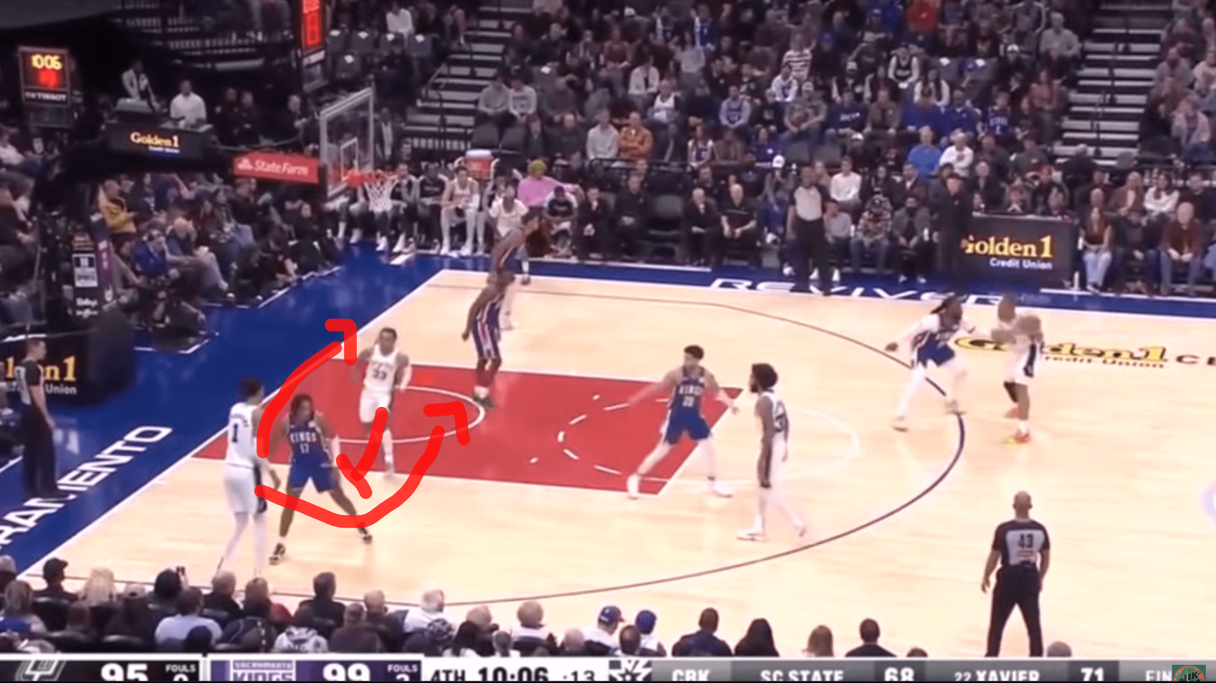 After setting the on-ball screen, Queta sets a “Gortat” screen that keeps Lopez from challenging Brown. A Gortat screen is when the screener seals or obstructs the opposing big while a handler is driving. It’s usually used to combat drop coverage.