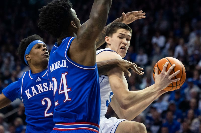Brigham Young Cougars guard Egor Demin (3) drives to the basket while being guarded by Kansas Jayhawks forward KJ Adams Jr. (24) and guard AJ Storr (2) during a game at the Marriott Center on the campus of BYU in Provo on Tuesday, Feb. 18, 2025. | Brice Tucker, Deseret News
