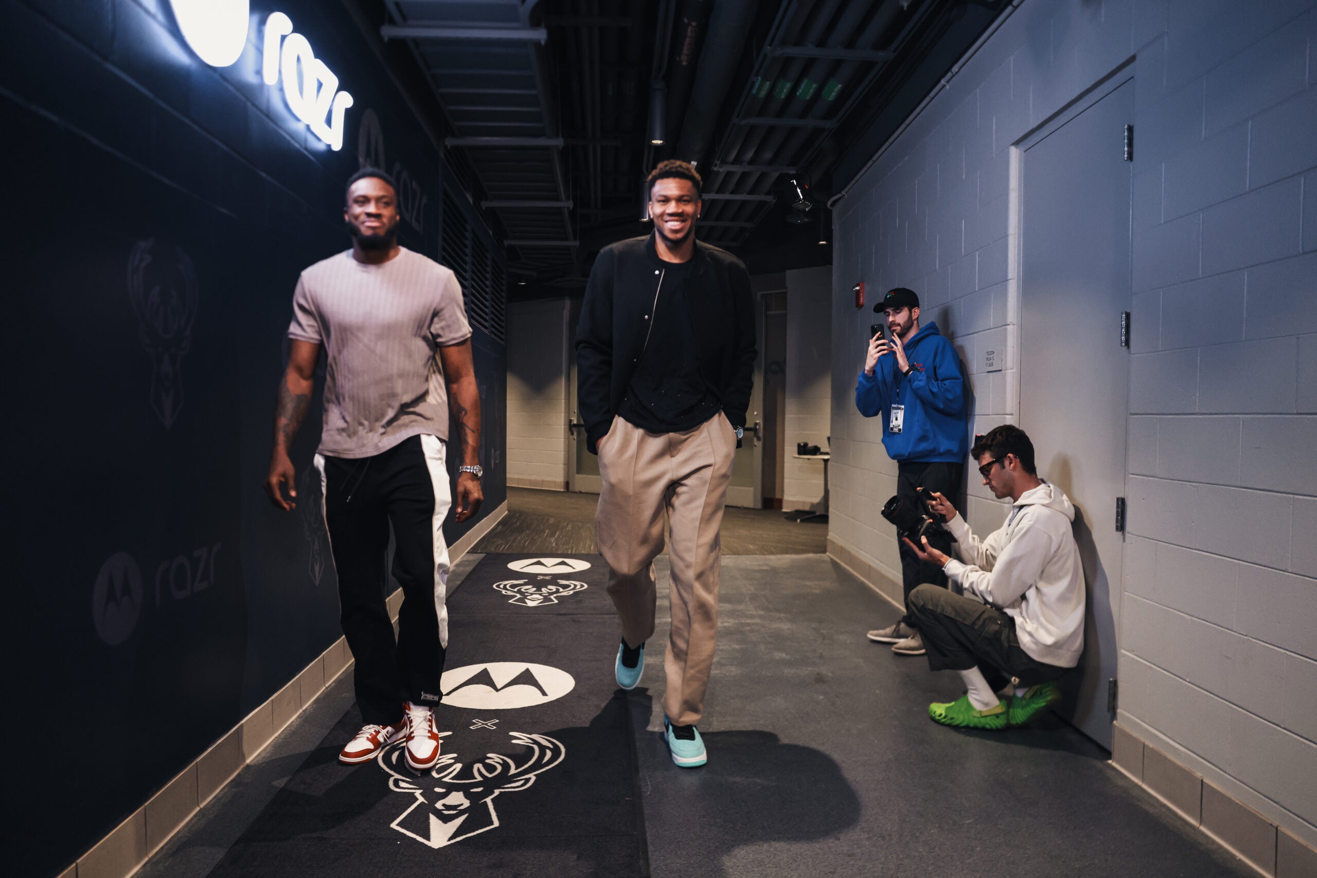Milwaukee Bucks Director of Social Media Jesse Clark, center right, records players Giannis Antetokounmpo, center left, and Thanasis Antetokounmpo, left walking in the Fiserv Forum. Photo courtesy of Jesse Clark