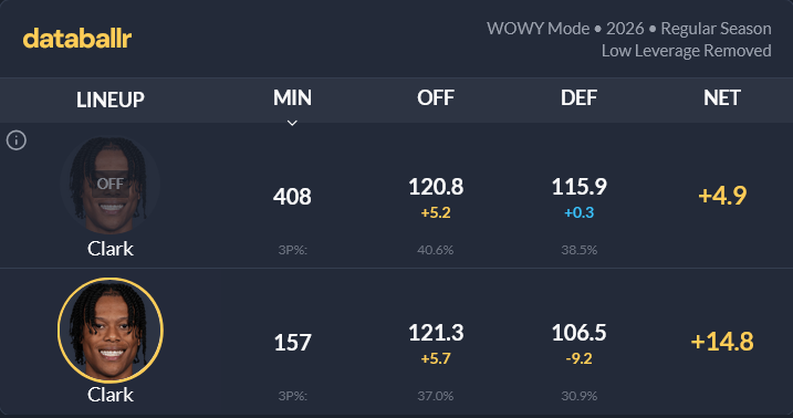 When Clark is on the court, the offensive rating (ORTG) remains similar to when Clark is on the bench. However, Minnesota’s defensive rating (DRTG) jumps from 115.9 when Clark is off the court, compared to 106.5 when Clark is on the court. As a result, opponents are scoring 9.2 points per 100 possessions less when Clark is on the court versus off the court.