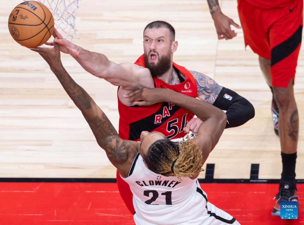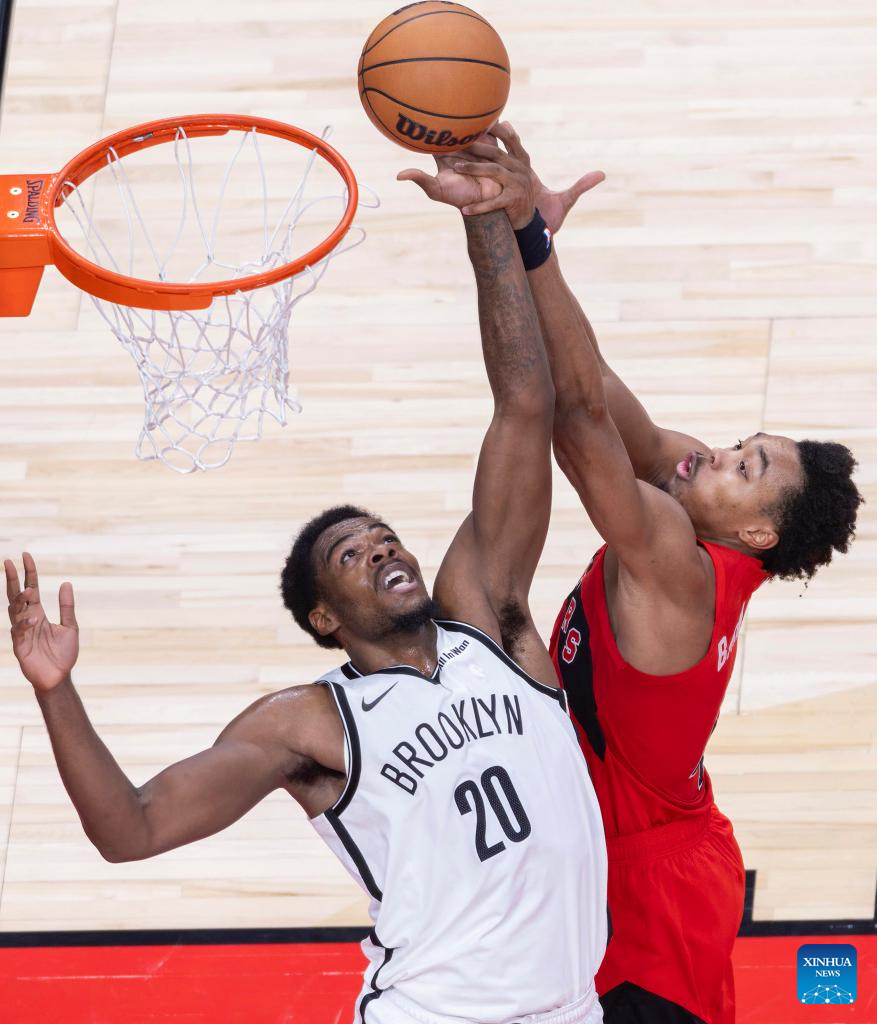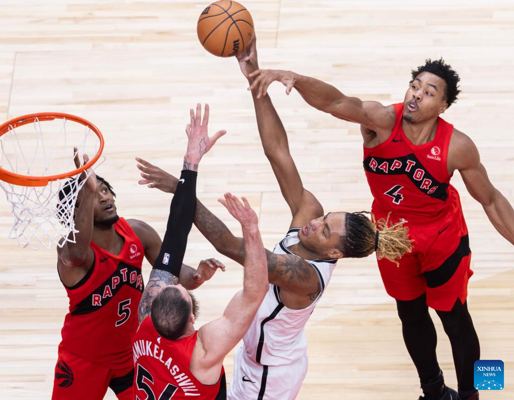 Noah Clowney (2nd R) of Brooklyn Nets makes a jump hook shot during the 2025-2026 NBA regular season game between Toronto Raptors and Brooklyn Nets in Toronto, Canada, on Nov. 23, 2025. (Photo by Zou Zheng/Xinhua)