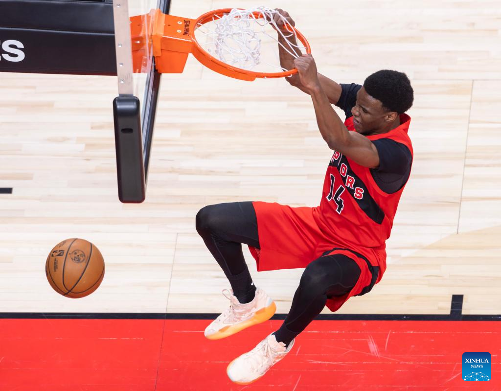 Ja’Kobe Walter of Toronto Raptors dunks during the 2025-2026 NBA regular season game between Toronto Raptors and Brooklyn Nets in Toronto, Canada, on Nov. 23, 2025. (Photo by Zou Zheng/Xinhua)
