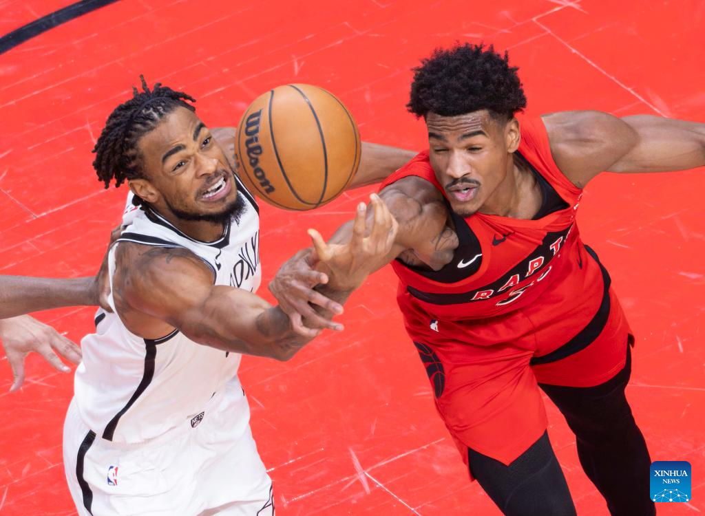 Ochai Agbaji (R) of Toronto Raptors vies with Nic Claxton of Brooklyn Nets during the 2025-2026 NBA regular season game between Toronto Raptors and Brooklyn Nets in Toronto, Canada, on Nov. 23, 2025. (Photo by Zou Zheng/Xinhua)