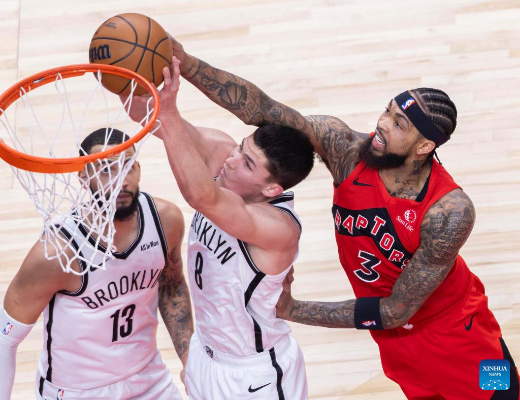 Brandon Ingram (R) of Toronto Raptors fights for a rebound with Egor Demin (C) of Brooklyn Nets during the 2025-2026 NBA regular season game between Toronto Raptors and Brooklyn Nets in Toronto, Canada, on Nov. 23, 2025. (Photo by Zou Zheng/Xinhua)