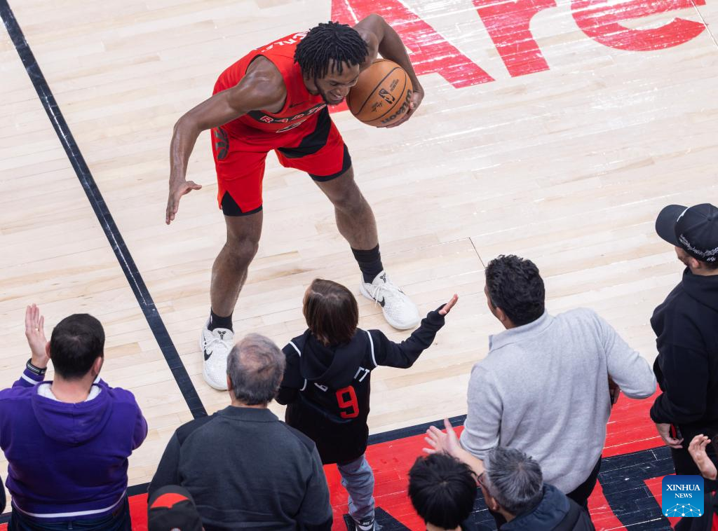 Scottie Barnes of Toronto Raptors dunks during the 2025-2026 NBA regular season game between Toronto Raptors and Brooklyn Nets in Toronto, Canada, on Nov. 23, 2025. (Photo by Zou Zheng/Xinhua)