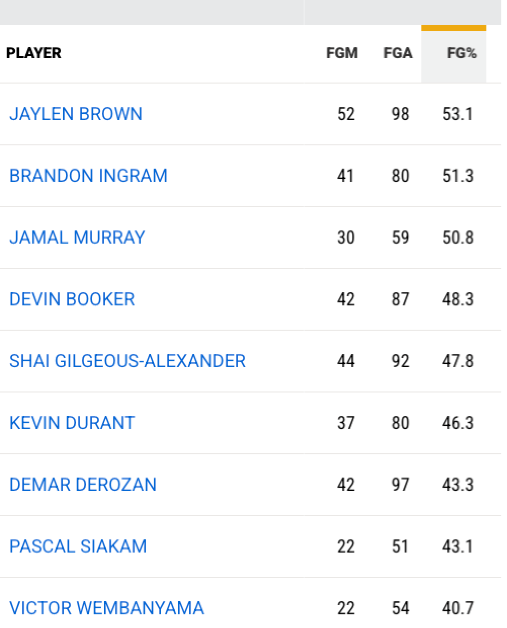 This season, 10 NBA players have attempted more than 50 midrange shots, a list that includes fellow midrange assassins Kevin Durant, Shai Gilgeous-Alexander, and Jamal Murray. From that exclusive group, Brown has been the most efficient, converting 53.1% of his 98 attempts.