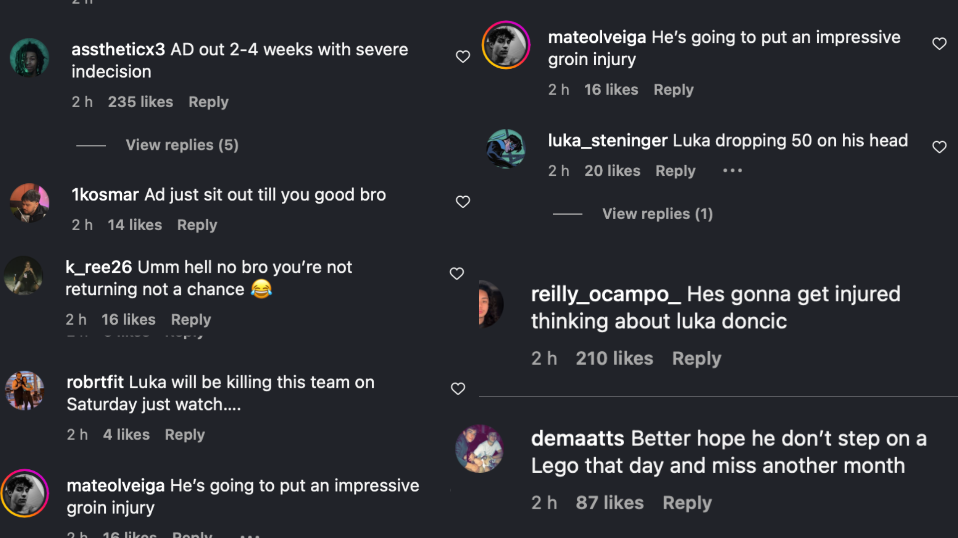 “Better hope he don’t step on a Lego that day and miss another month,” one fan mocked AD’s injury struggles.