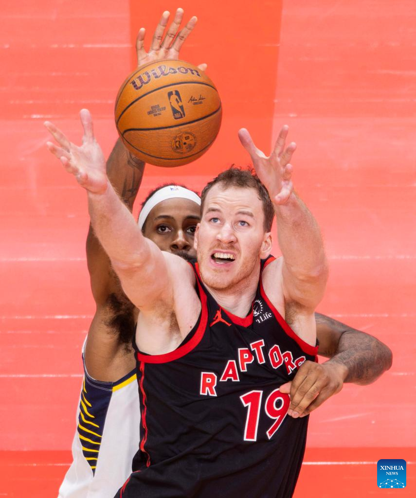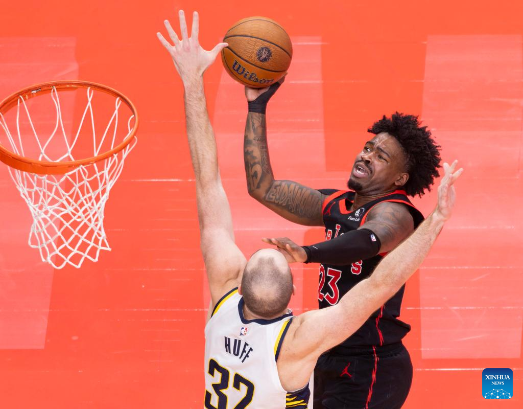 Jakob Poeltl (R) of Toronto Raptors vies with Bennedict Mathurin of Indiana Pacers during the 2025-2026 NBA Cup group match between Toronto Raptors and Indiana Pacers in Toronto, Canada, on Nov. 26, 2025. (Photo by Zou Zheng/Xinhua)