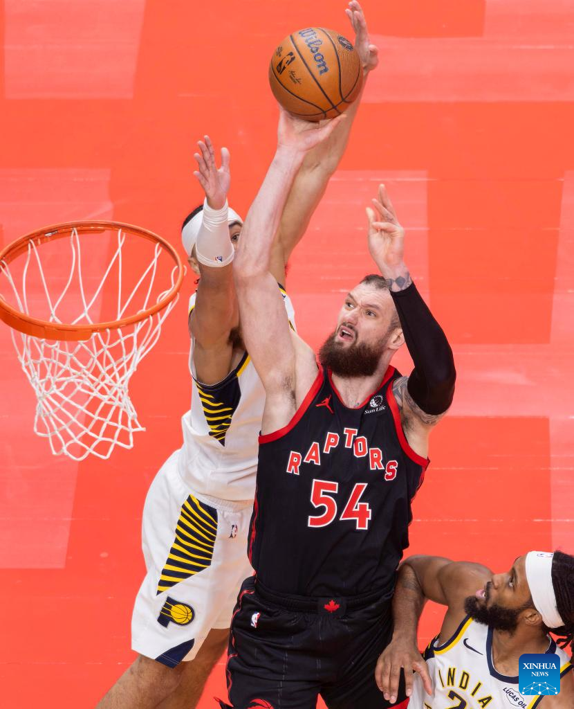 Jakob Poeltl (front) of Toronto Raptors fights for a rebound with Isaiah Jackson of Indiana Pacers during the 2025-2026 NBA Cup group match between Toronto Raptors and Indiana Pacers in Toronto, Canada, on Nov. 26, 2025. (Photo by Zou Zheng/Xinhua)