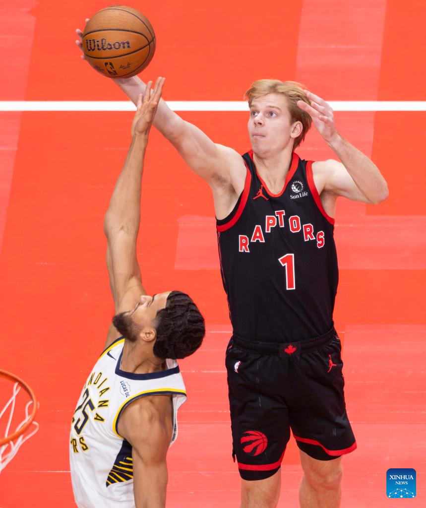 Sandro Mamukelashvili (C) of Toronto Raptors shoots during the 2025-2026 NBA Cup group match between Toronto Raptors and Indiana Pacers in Toronto, Canada, on Nov. 26, 2025. (Photo by Zou Zheng/Xinhua)