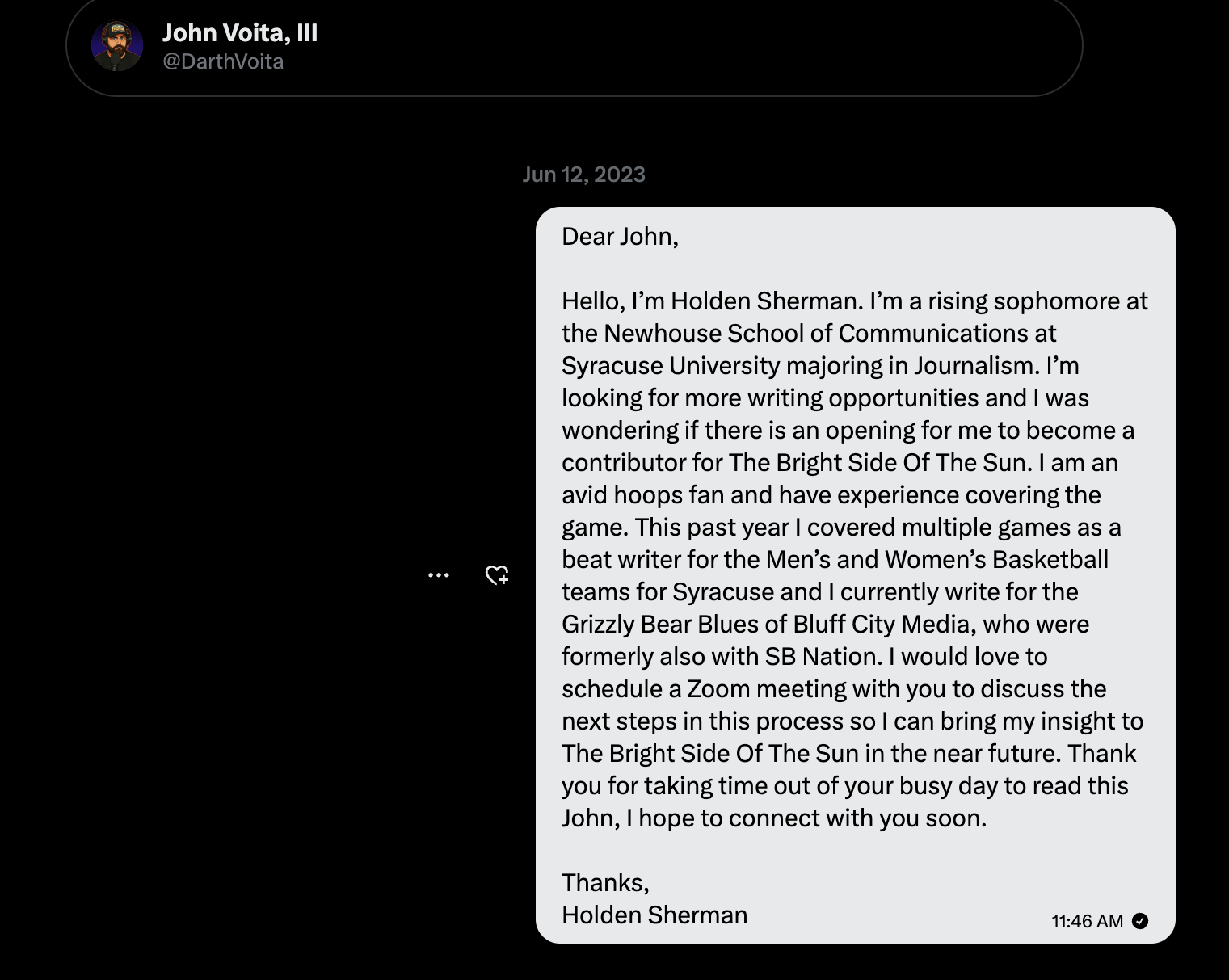 Unlike many on staff, I’m actually not a Phoenix Suns fan. I’m also the youngest person on staff, yet one of the longest tenured. I’m a journalism student at Syracuse University. I’m just a 22-year-old who is looking for every opportunity I can to work in sports media, and luckily, site manager John Voita saw, read, and responded to my 161-word DM on what was then called Twitter more than two years ago to get this gig started for me.