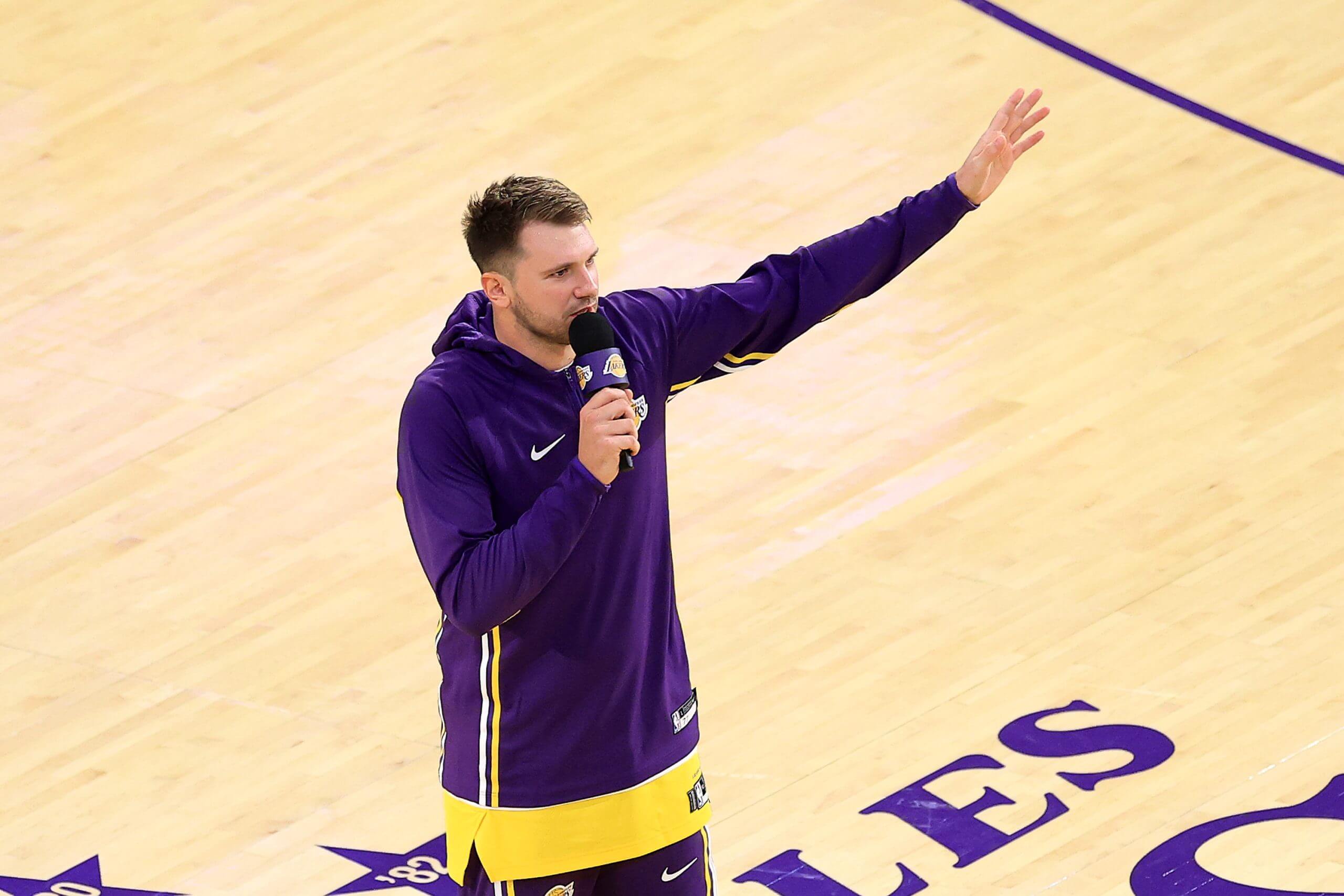 Luka Dončić speaks to the fans at Crypto.com Arena before a Lakers game against the Golden State Warriors in October. (Luke Hales / Getty Images)