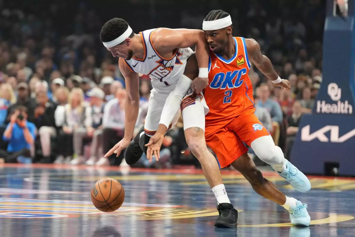 Oklahoma City Thunder guard Shai Gilgeous-Alexander, right, tries to steal the ball from Phoenix Suns guard Devin Booker during the first half of an NBA Cup basketball game, Friday, Nov. 28, 2025, in Oklahoma City. (AP Photo/Kyle Phillips)