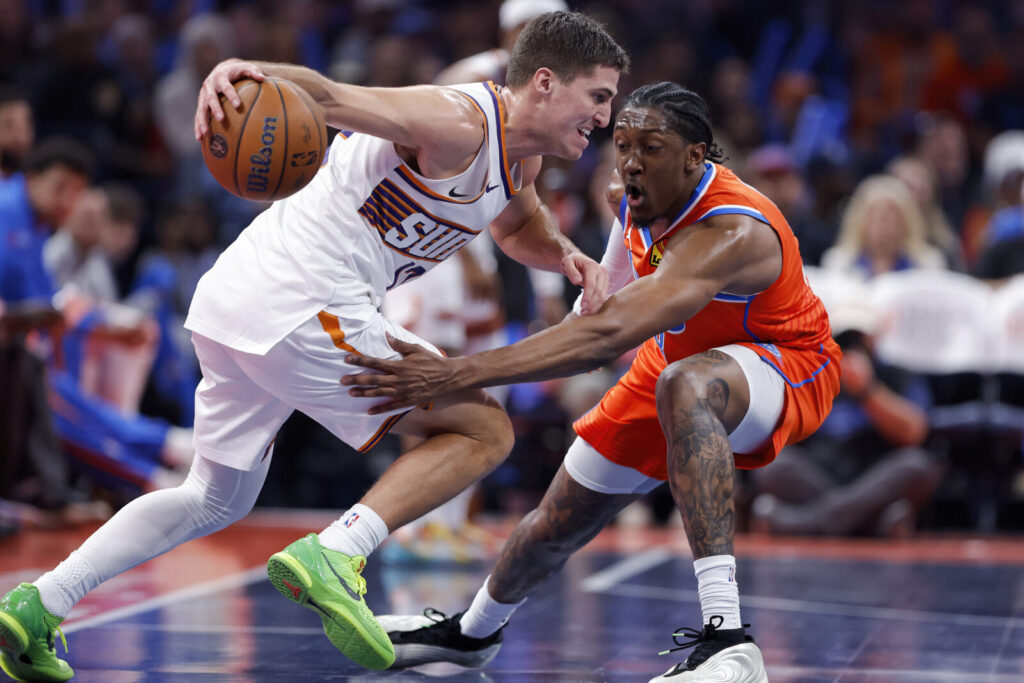 Nov 28, 2025; Oklahoma City, Oklahoma, USA; Phoenix Suns guard Collin Gillespie (12) moves the ball as Oklahoma City Thunder guard Jalen Williams (8) defends during the second half at Paycom Center. Mandatory Credit: Alonzo Adams-Imagn Images