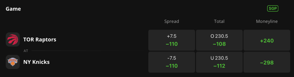 The Knicks enter as 7.5-point favorites and hold -298 moneyline odds on DraftKings Sportsbook. The Raptors are +240 underdogs, with the game total set at 230.5 points.