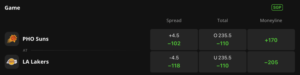 The Lakers enter as 4.5-point favorites and hold -205 Moneyline odds on DraftKings Sportsbook. The Suns are +170 underdogs, with the game total set at 235.5 points.