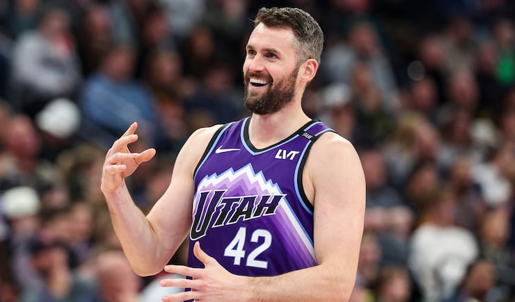 Utah Jazz forward Kevin Love (42) reacts after the play during the second half of an NBA game against the Houston Rockets at the Delta Center in Salt Lake City on Monday, Dec. 1, 2025. | Rio Giancarlo, Deseret News