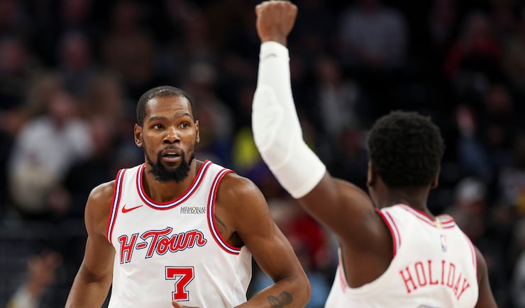 Houston Rockets guard Aaron Holiday (0) celebrates after forward Kevin Durant (7) made a 3-pointer during the second half of an NBA game against the Utah Jazz at the Delta Center in Salt Lake City on Monday, Dec. 1, 2025. | Rio Giancarlo, Deseret News