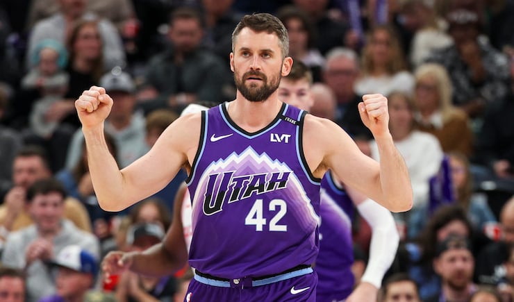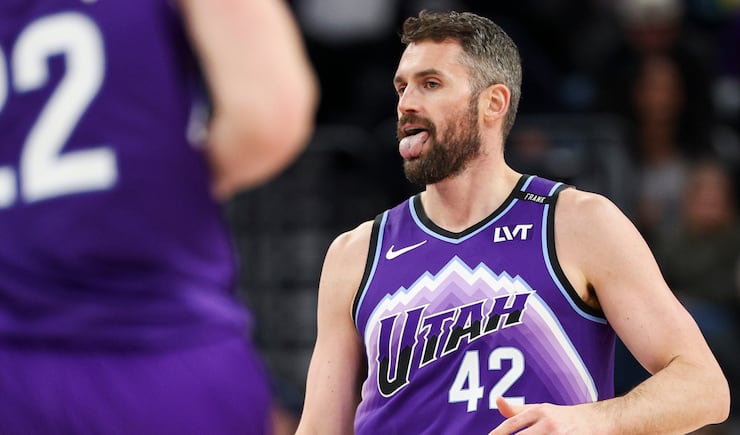 Utah Jazz forward Kevin Love (42) sticks out his tongue as he celebrates making a 3-pointer during the second half of an NBA game against the Houston Rockets at the Delta Center in Salt Lake City on Monday, Dec. 1, 2025. | Rio Giancarlo, Deseret News