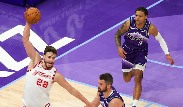 Houston Rockets center Alperen Șengün (28) catches a pass over Utah Jazz forward Kevin Love (42) during the first half of an NBA game at the Delta Center in Salt Lake City on Monday, Dec. 1, 2025. | Rio Giancarlo, Deseret News
