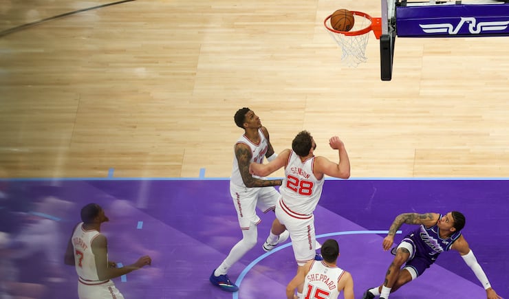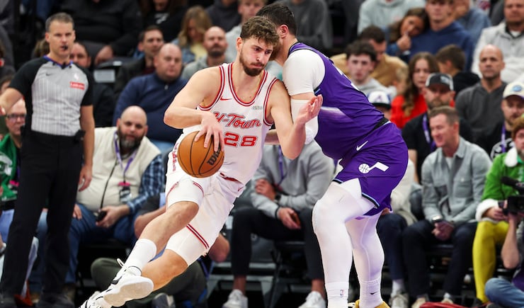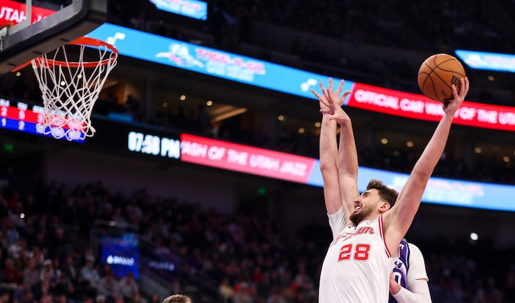 Houston Rockets center Alperen Șengün (28) shoots a 3-pointer over Utah Jazz center Jusuf Nurkić (30) during the first half of an NBA game at the Delta Center in Salt Lake City on Monday, Dec. 1, 2025. | Rio Giancarlo, Deseret News