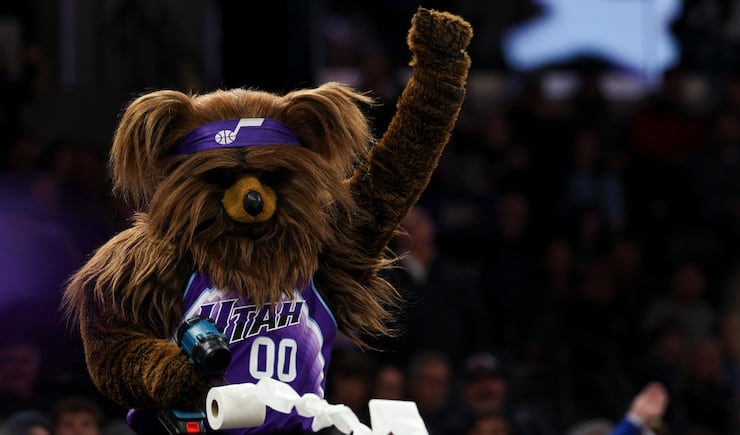 The Jazz Bear blows toilet papers onto fans during an NBA game between the Utah Jazz and the Houston Rockets at the Delta Center in Salt Lake City on Monday, Dec. 1, 2025. | Rio Giancarlo, Deseret News