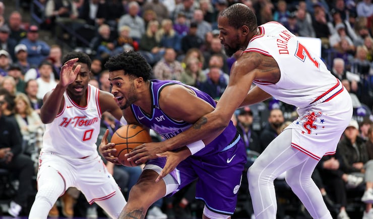 Utah Jazz forward Brice Sensabaugh (28) steals the ball from Houston Rockets forward Kevin Durant (7) during the second half of an NBA game at the Delta Center in Salt Lake City on Monday, Dec. 1, 2025. | Rio Giancarlo, Deseret News