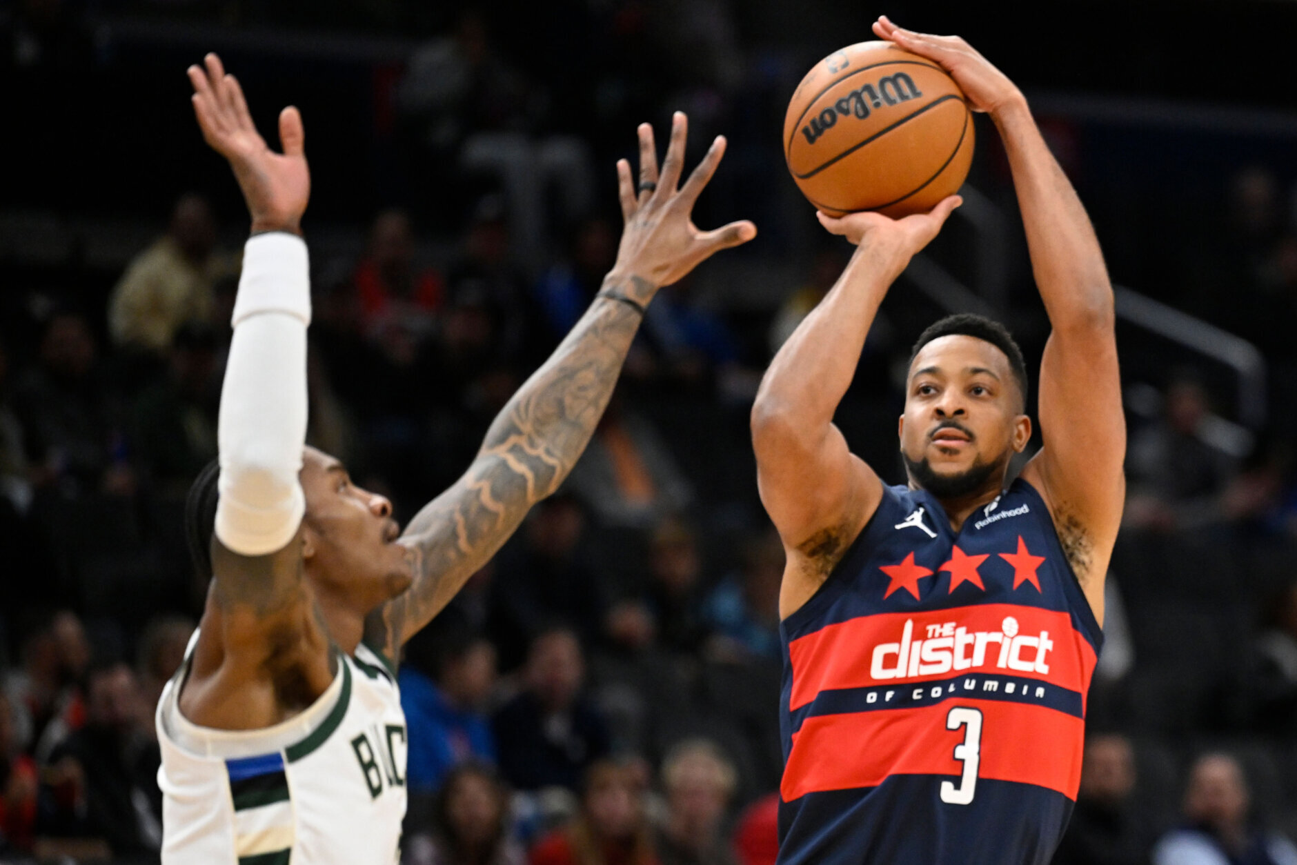 Bucks Wizards Basketball Washington Wizards guard CJ McCollum (3) prepares to shoot a 3-point basket over Milwaukee Bucks guard Kevin Porter Jr., left, during the first half of an NBA basketball game Monday, Dec. 1, 2025, in Washington. (AP Photo/John McDonnell)