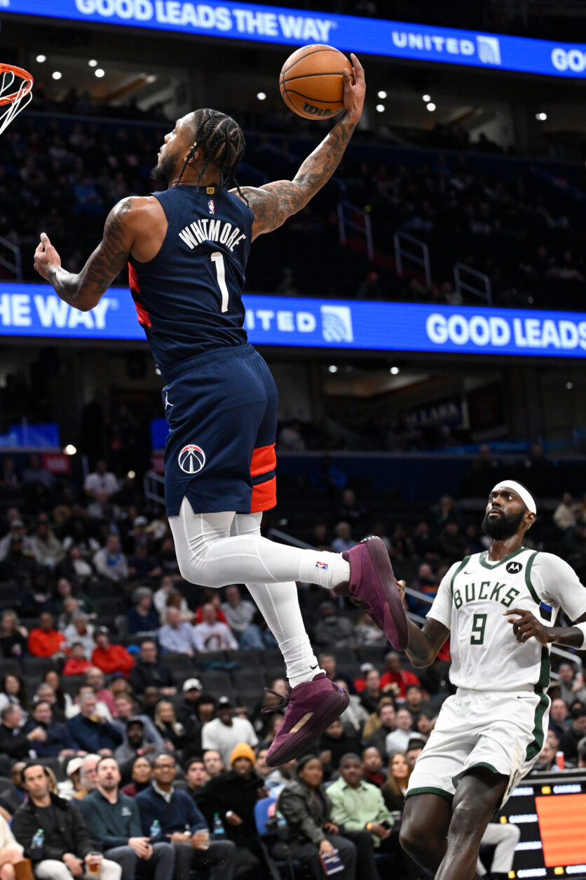 Bucks Wizards Basketball Washington Wizards forward Cam Whitmore (1) goes up to dunk over Milwaukee Bucks forward Bobby Portis (9) during the first half of an NBA basketball game Monday, Dec. 1, 2025, in Washington. (AP Photo/John McDonnell)