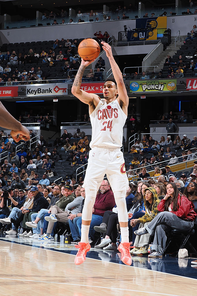 Tyrese Proctor #24 of the Cleveland Cavaliers shoots a three point basket during the game against the Indiana Pacers on December 1, 2025 at Gainbridge Fieldhouse in Indianapolis, Indiana. Photo: Ron Hoskins/NBAE via Getty Images