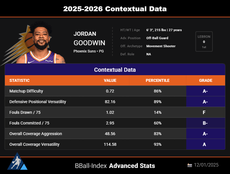 Frequently used as a “chaser” or a “ball pressure specialist,” Jordan Goodwin’s profile fits perfectly into Phoenix’s defensive identity. While Dillon Brooks and Ryan Dunn are tasked with guarding the opposing star, the guard is usually assigned to the opposing backcourt, preferably on the primary ball handler.