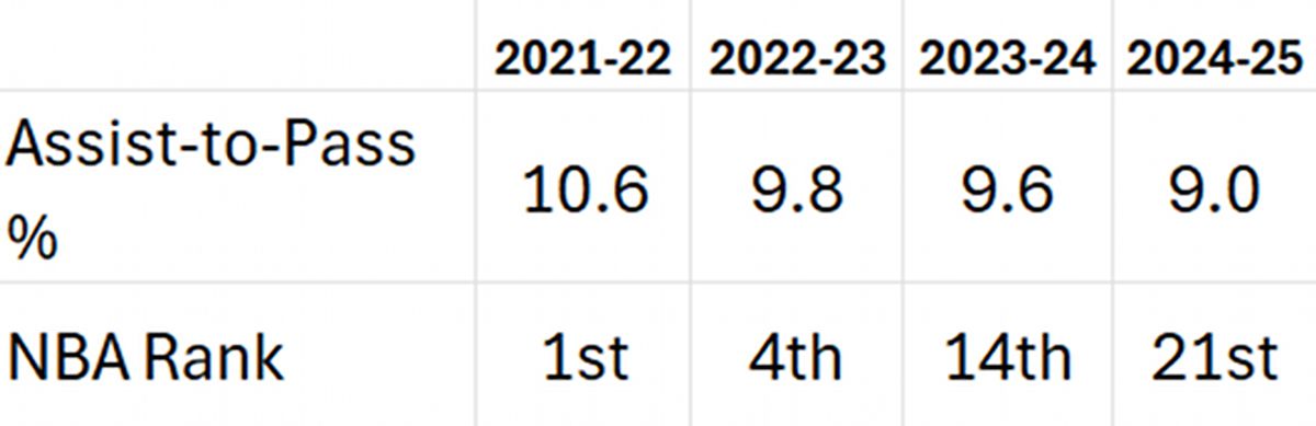 Or passes. In 2021-22, the Suns averaged 258.8 passes per game (28th) but 27.4 assists per game (fourth) for an assist-to-pass percentage of 10.6 (1st by nearly a full percentage point). By 2024-25, the Suns were averaging 307.6 passes per game (fourth) but 27.8 assists per game (10th), meaning just 9.0 percent of their passes resulted in an assist (21st).