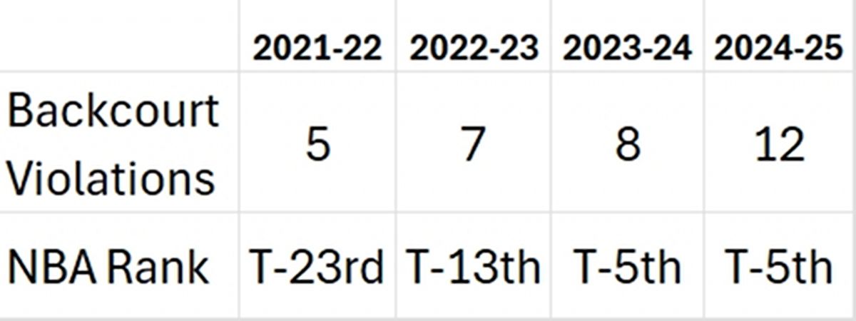 Or backcourt violations. 2021-22: Five violations, tied for 23rd. 2024-25: Twelve violations, tied for fifth.