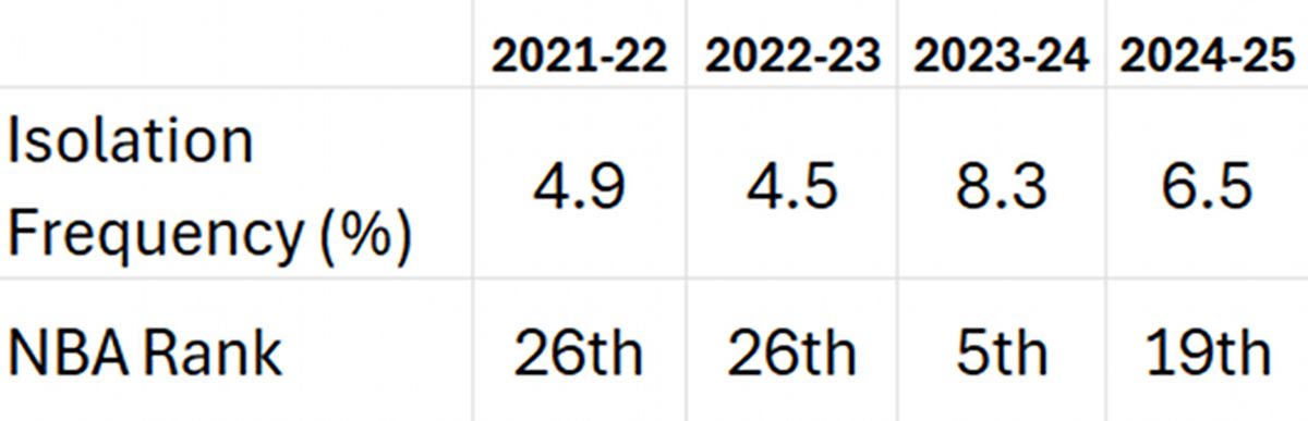 In both 2021-22 and 2022-23, the Suns finished in the bottom five in the league, running isos less than five percent of the time.