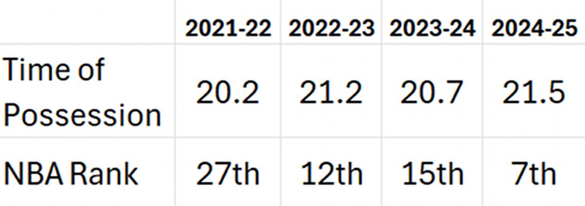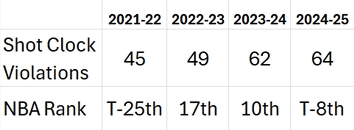 Let’s try shot clock violations. 2021-22: 45 violations, tied for 25th in the NBA. 2024-25: 64 violations, tied for eighth in the NBA.